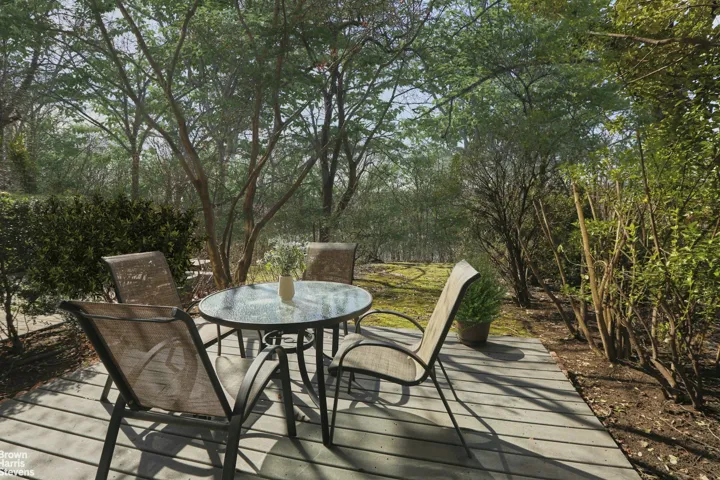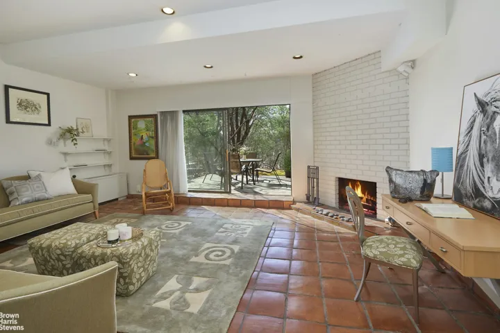 The lower level opens to a beautifully landscaped private garden with natural foliage and serene views of the Hudson and Palisades. A corner wood-burning fireplace enhances the cozy atmosphere-perfect for movie nights. Sliding glass doors lead to a rear deck, ideal for a grill setup, and equipped with a water hose connection for gardening. This level also features a windowed fourth bedroom or home office, a laundry room, and a full bathroom.