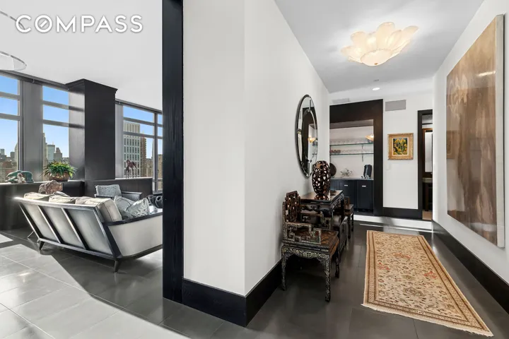 Upon arrival, a grand entryway with soaring ceilings welcomes you with ample space for seating and gallery-worthy walls for art display, setting the tone for the exceptional home that lies beyond. The heart of this penthouse is the expansive Great Room, a masterful space with soaring proportions, a sleek wood-burning fireplace, and unrivaled panoramic views. Perfectly designed for entertaining, the Great Room opens onto one of two expansive terraces, ideal for hosting soirées or enjoying tranquil moments above the bustling city. Adjacent, a refined powder room and a thoughtfully placed dry bar add convenience and sophistication.