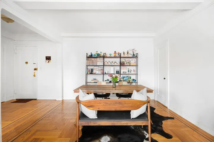 Apartment features include a king-sized bedroom, corner living room windows, separate dining, dedicated workspace, oversized foyer, patterned art deco hardwood floors, windowed, eat-in kitchen and bathroom, and partial Hudson River view.