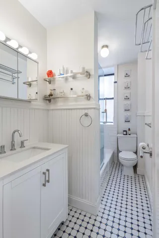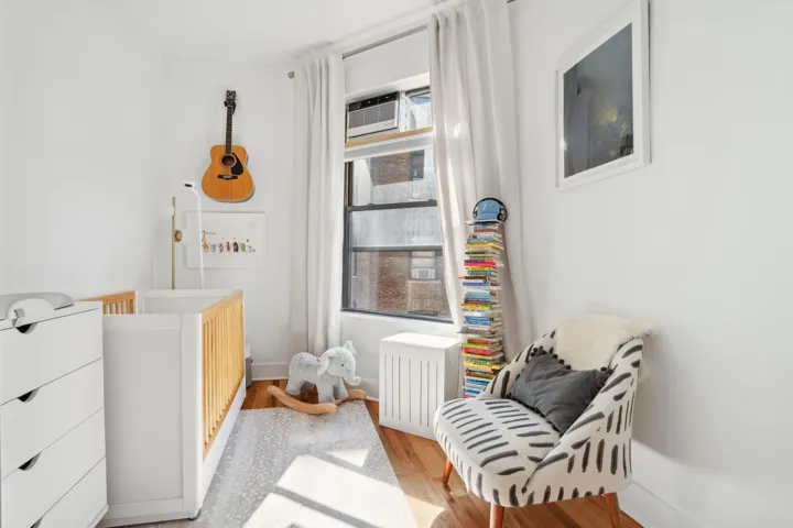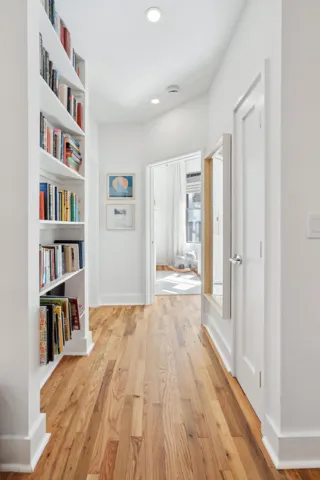 Enter the bedroom wing through floor-to-ceiling bookshelves, flanked by a deep floor-to-ceiling storage and linen closets. The primary bedroom is flooded in sun from double exposure, looking out over trees and a courtyard garden. The space can fit a king sized bed, and boasts a decorative fireplace, two oversized closets, and ample room for furniture. The secondary bedroom also gets amazing light and has room for furniture plus another floor to ceiling closet. Both bedrooms face a quiet courtyard.