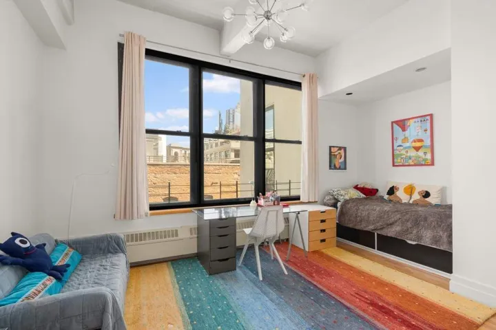 Upon entering through the spacious foyer, you’ll immediately be struck by the impressive scale of this open concept space. This expansive, light-filled living area features walls of oversized windows that wrap the southern and eastern exposures along with one picturesque north-facing window that perfectly frames the Manhattan Bridge. The soaring 11 plus foot concrete-beamed ceilings, hardwood flooring throughout, and the sheer size of this open and flowing floorplan truly makes this the definition of DUMBO loft living.