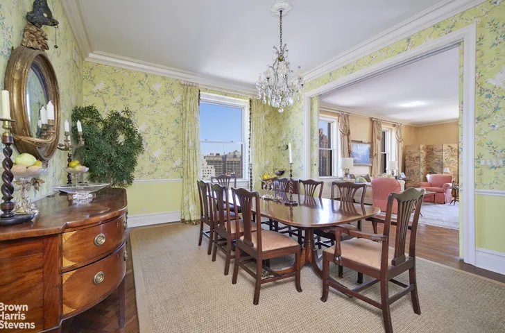 Grand, sun-flooded 3 bedroom residence with soaring 10+ foot ceilings and panoramic skyline views of Park Avenue and beyond — reaching all the way to the East River. This elegant home is abound with classic pre-war details featuring: crown, dental and chair rail moldings, beautiful herringbone floors, oversized windows and copious closet space. One enters from the semi-private elevator landing into a stately formal entry gallery where a paneled archway leads to the 27-foot, expansive corner living room, with multiple seating areas and a marble-mantled gas fireplace. The traditional formal dining room is accessed from the living room through pocket doors, making this sublime home perfect for large or intimate entertaining. Off the dining room is a spacious windowed kitchen with glass-front cabinets and granite countertops replete with a sizeable walk-in pantry. On the far side of the gallery is the well-appointed library lined with custom bookcases, built-ins and a charming dry bar. The shared en-suite bath connects to the spacious second bedroom with light-filled Eastern views. A long, private hallway lined with mirrored floor-to-ceiling wardrobes accesses the enormous corner primary bedroom with walk-in closet and a luxurious en-suite bath. There is central air in the public rooms and a basement storage unit is included. Can be combined with neighboring apartment 16AE to create a full floor residence.