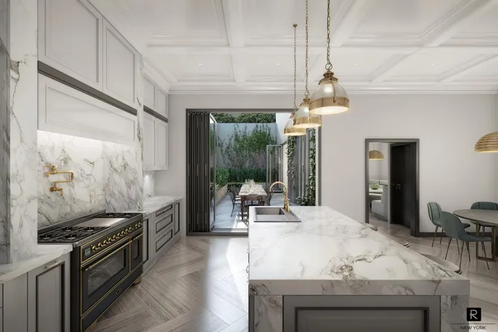 Every detail of the home will be meticulously curated: from the restored oak hardwood floors and hand-carved decorative fireplaces to the radiant heated marble bathrooms and custom lighting throughout. A private elevator provides seamless access across all five sprawling levels, each with soaring ceiling heights and magnificent scale.