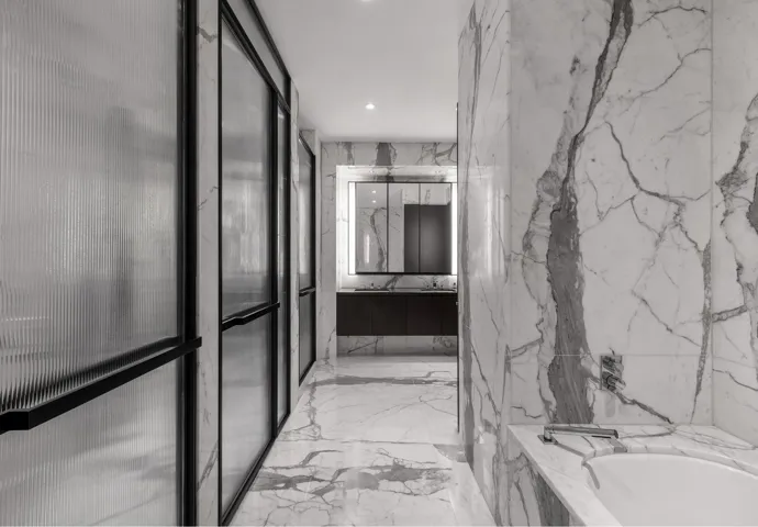 The southwest wing is devoted to an expansive, 1,200+ square foot primary suite, featuring a corner bedroom with extraordinary river views, a private study, a windowed dressing room, and a five-fixture marble-clad bath. A den off the primary suite also captures direct park views, as does the bedroom, powder room, entry foyer, and formal living room. Throughout the home, room proportions are simply incredible, with each of the four additional bedrooms boasting generous scale and ensuite baths appointed with Dornbracht fixtures and custom vanities by Thomas Juul Hansen. Additional features include two private entrances, a powder room, laundry room, integrated A/V system, and a multi-zone climate control system-all underscoring Residence 52B’s commitment to quiet, uncompromising luxury.