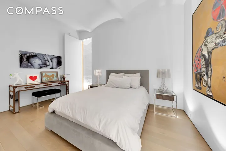 Accessed by a private, key-locked elevator, you are greeted by an impressive great room with soaring 11-foot barrel-vaulted ceilings, massive double-height windows, and sweeping views of Broadway’s landmarked cast iron buildings. This light-filled space, designed for grand entertaining, effortlessly accommodates dining and seating areas under ambient LED lighting, while wide-plank oak floors add warmth and character throughout.
