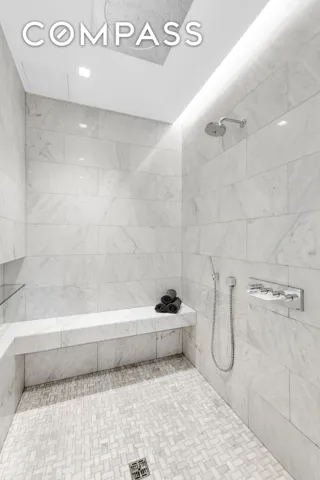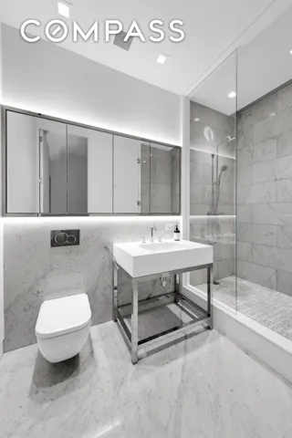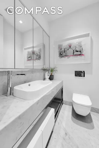 The primary suite serves as a private retreat, featuring a luxurious bath adorned in Carrara marble, a custom double vanity, a soaking tub, a rain shower, and a spacious California walk-in closet. An additional well-appointed bedroom includes an en-suite bath with marble finishes and custom closet, ensuring ample space for comfort and privacy. The suite also features a discreet washer/dryer unit within the primary closet for ultimate convenience.