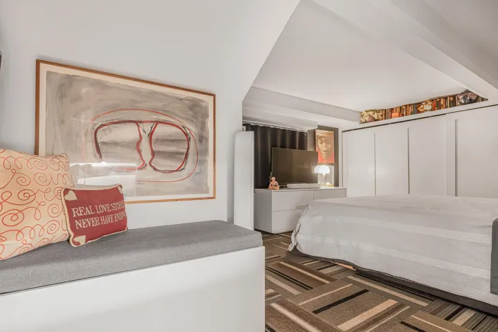 A striking staircase leads to the mezzanine-level king-sized loft bedroom, complete with custom closets and additional storage, offering the perfect blend of privacy and open-concept design.