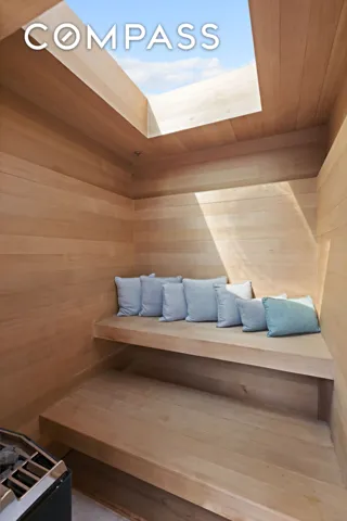 The top floor includes a rooftop lounge, located behind the building’s meticulously restored façade, along with an outdoor covered terrace and a spa area. Planting design by Piet Oudolf landscape architect. A long architectural element in natural stone unifies the different areas, creating a strong relationship between interior and exterior spaces, and housing a concealed firepit, an outdoor and indoor kitchen counter and the hot tub and sauna. Assessment in place until December 2026 for $2,086.01/ month.
