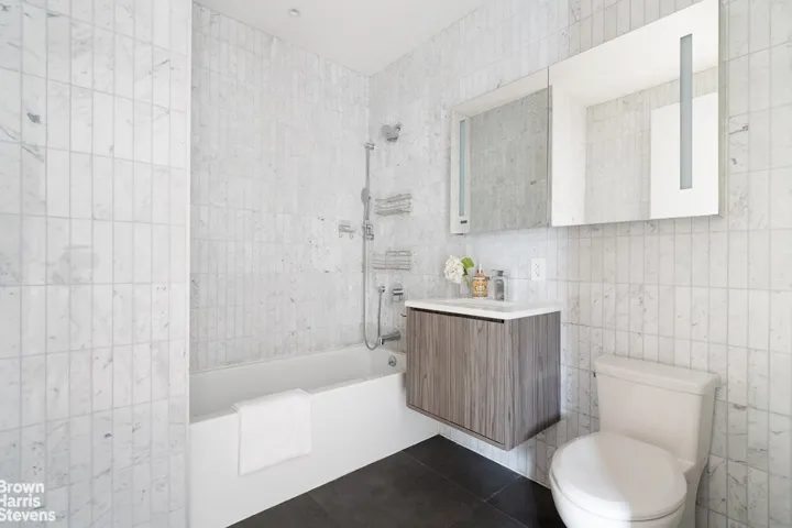 There is a 2nd full-sized bathroom with soaking tub graced with carrera tiles and modern fixtures.