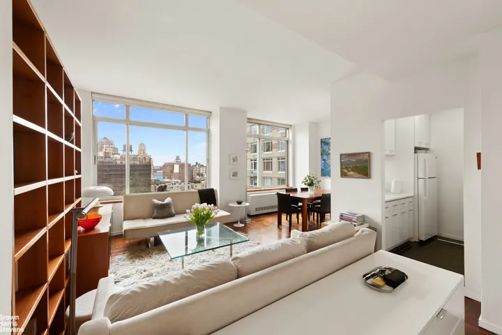 Opportunity knocking for this rarely available XL, One Bedroom, Two FULL Bath home which easily converts to a true TWO BEDROOM home with an additional foot in ceiling height! This west-facing home is extremely bright and has partial river views as an added bonus to this rare jewel. The all white kitchen has a pass through into the dining area which can also be extended and closed to create a private office or bedroom. The king-sized bedroom boasts an ensuite bathroom and has a separate built-in shelf being used as a desk for the work from home residents. There are 4 closets in total including a very large walk in! There is a current monthly assessment of $256.58 ending 12/1/2025.