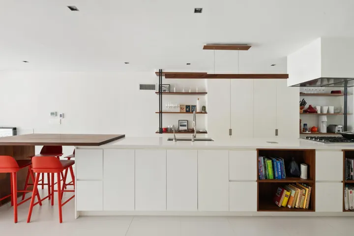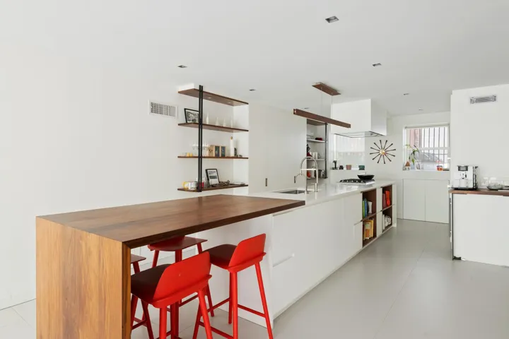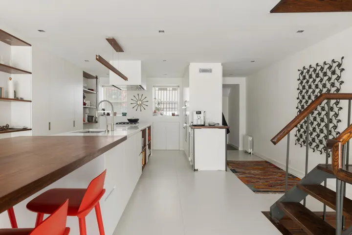 Entering through a private gated forecourt, you’re greeted immediately by a convenient coat closet, leading into an expansive open kitchen with radiant heated floors, custom cabinetry, Caesarstone countertops, and premium appliances. Steps down from the kitchen lead to a bright, light-filled family room and dining area featuring a glass block ceiling which bathes the entire level in natural light. The garden level has been built out to lot depth, making the level feel oversized and ideal for hosting.