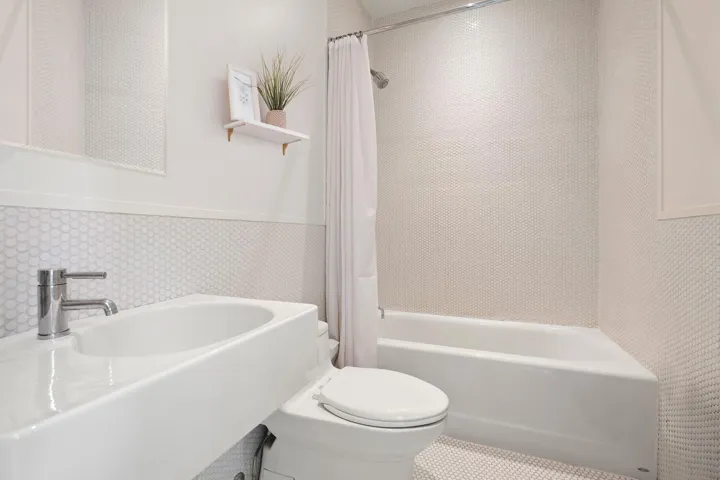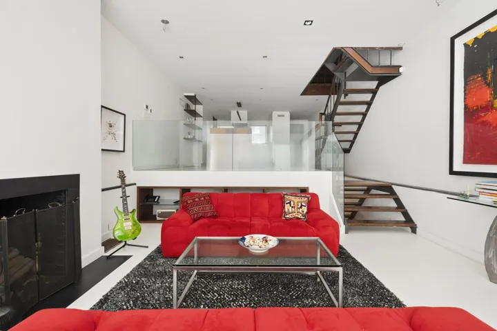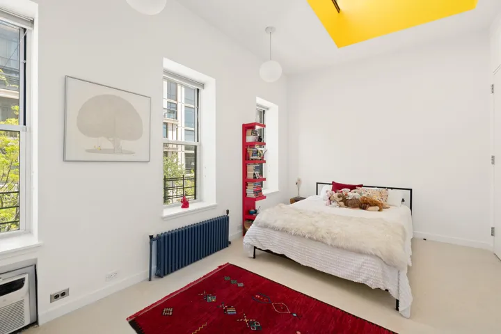 Three inviting bedrooms await on the top floor, each offering its own distinct charm. One features a dramatic vaulted ceiling and lofty windows that flood the space with natural light, creating a serene, almost ethereal retreat. The two additional bedrooms enjoy sunny southern exposures, with picturesque views overlooking the tranquil patio and the historic charm of private Henderson Place. These rooms share two full bathrooms.