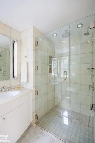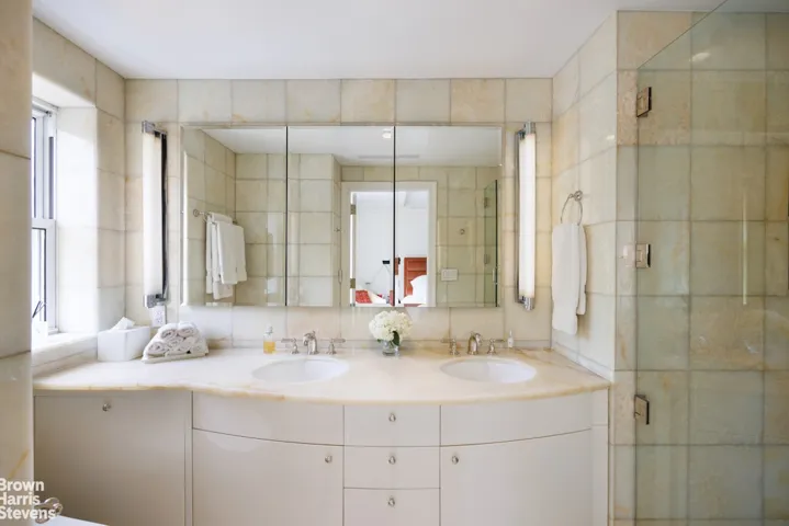 In its own private wing are the two spacious bedrooms and two full bathrooms. The oversized primary suite offers tranquil and beautiful Eastern views of Central Park and the Reservoir. It features a walk-in closet, and a beautifully renovated windowed en-suite bathroom clad in luxurious onyx. The primary bedroom includes double sinks, three vanity mirrors, a Toto toilet, and a large rain shower. The second bedroom features lovely built in bookcases and desks. Adjacent to the second bedroom is the renovated second bathroom with deep soaking tub.