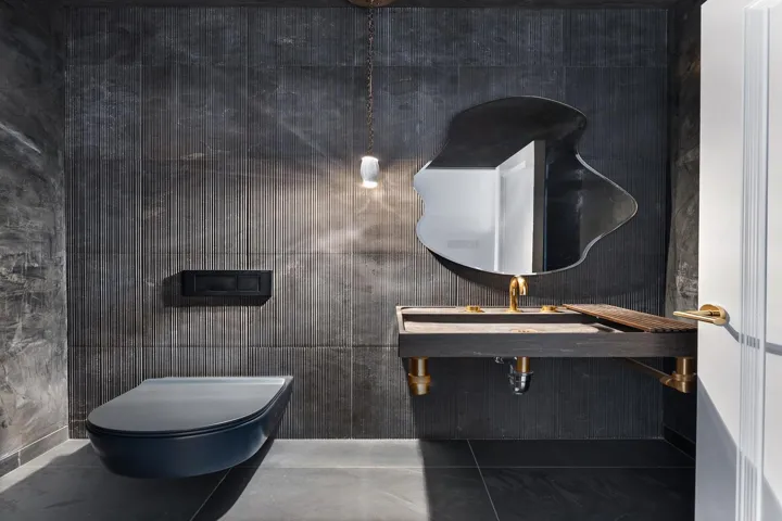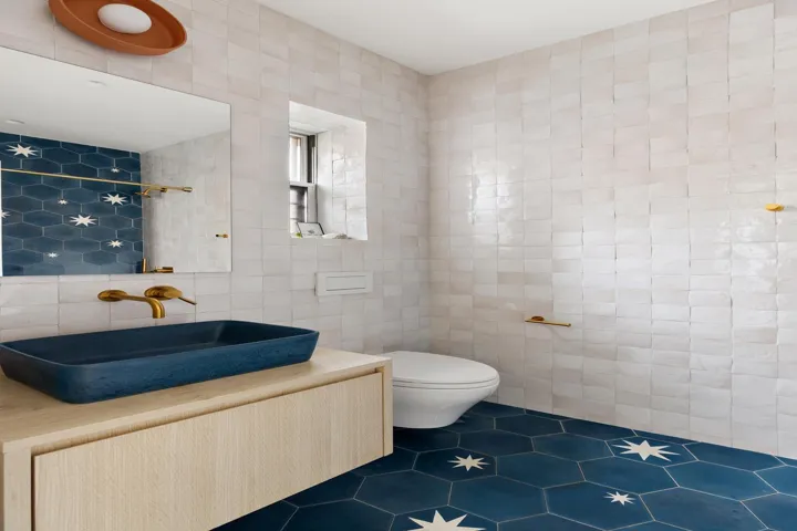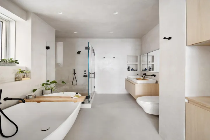 The east-facing primary suite is a private sanctuary filled with morning light and quiet charm. Its en-suite bathroom is a calming retreat, with hand-applied Tadelakt walls, a freestanding Blu Bathworks soaking tub, Dornbracht and La Cava fixtures, a Concretti sink, and a Geberit wall-mounted toilet. Each bathroom in the home has been carefully crafted with custom cabinetry and high-end finishes, including a powder room finished in soft Roman clay.