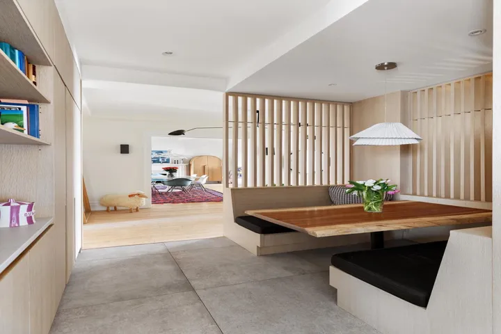The custom eat-in kitchen is designed to bring people together. It features hand-crafted cabinetry, durable Caesarstone countertops, and top-of-the-line Miele appliances—including a washer/dryer. A stunning banquette table made from Golden Acacia wood adds a natural warmth, inviting long breakfasts or cozy evening meals.