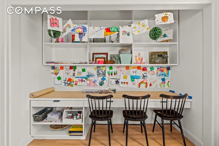 On the second floor are 4 huge, sundrenched bedrooms, one of which is being used as a family room complete with a built-in craft table and swing. Two of the bedrooms, both with gorgeous bay windows and window seats, share a Jack and Jill bath with a marble top double vanity, a big glass-enclosed shower, freestanding bathtub and handmade Commune, Malmo Pattern floor tile. The 4th bedroom has a stunning, original, curved glass window and an adjacent full bath with shower/tub combo. An added bonus is the convenient laundry room with front loading LG washer and dryer, sink,marble countertop and built in hanging racks.