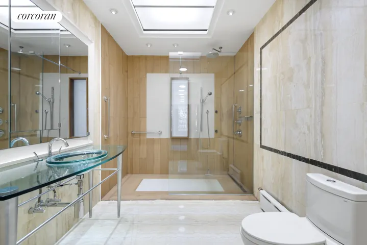Explore the Owner’s triplex by stepping onto the gorgeous parlor level floor, where a spacious living room with 11+-ft ceilings welcomes you. The foyer leads to a powder room, and beyond lies a masterfully designed chef’s kitchen equipped with high-end Thermador Professional appliances and expansive countertops. Floor-to-ceiling sliding glass doors open to a dining deck overlooking the meticulously landscaped private garden.