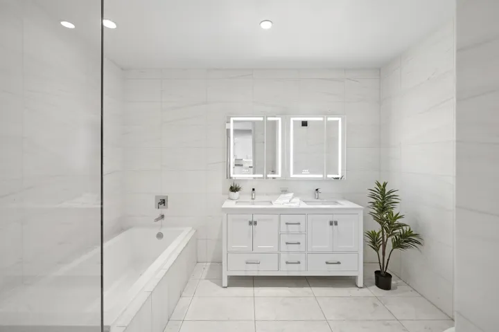 The home begins with a sprawling open-plan living room, dining room, and kitchen suffused with natural light. The chef’s kitchen is adorned with an eat-in island , chic marble countertops, a matching backsplash, custom white lacquer cabinetry, and integrated high-end appliances from Liebherr, Miele, and Sub-Zero.