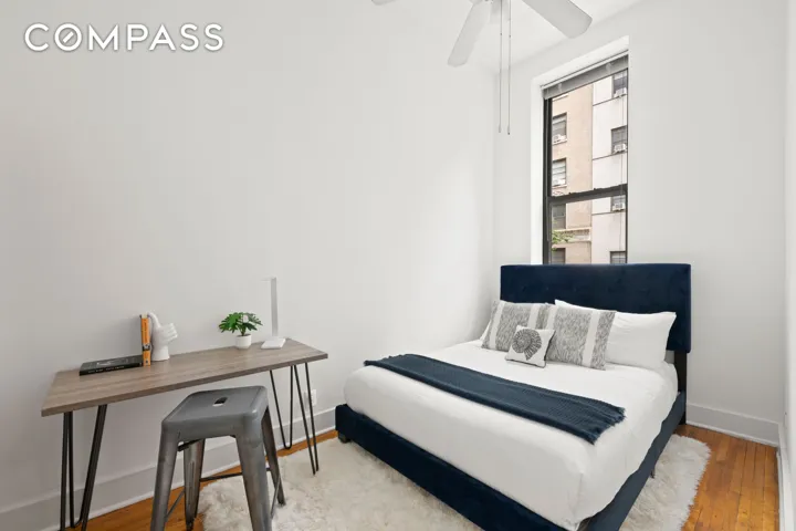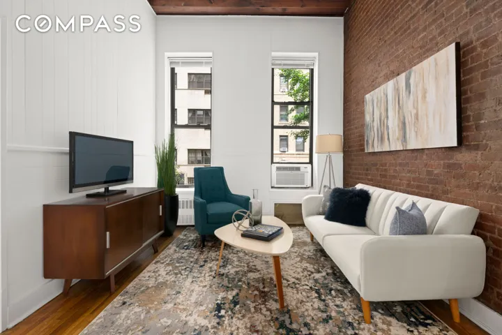 Inside this charming home, ceilings soar more than 12 feet high above extra-tall windows, ceiling fans, original hardwood floors and exposed brick. A large entry closet welcomes you into the raised foyer, while below, the living room provides a generous footprint for seating and dining areas surrounded by northern exposures and sky-high ceilings trimmed with wood. The efficient kitchen is filled with white cabinetry and appliances, while the adjacent closet is perfect for pantry storage. The bedroom accommodates a queen-size bed and desk area and includes its own closet with abundant overhead space, ensuring storage will never be a concern. A full bathroom with a large/tub shower and roomy vanity cabinet completes this delightful co-op with potential.