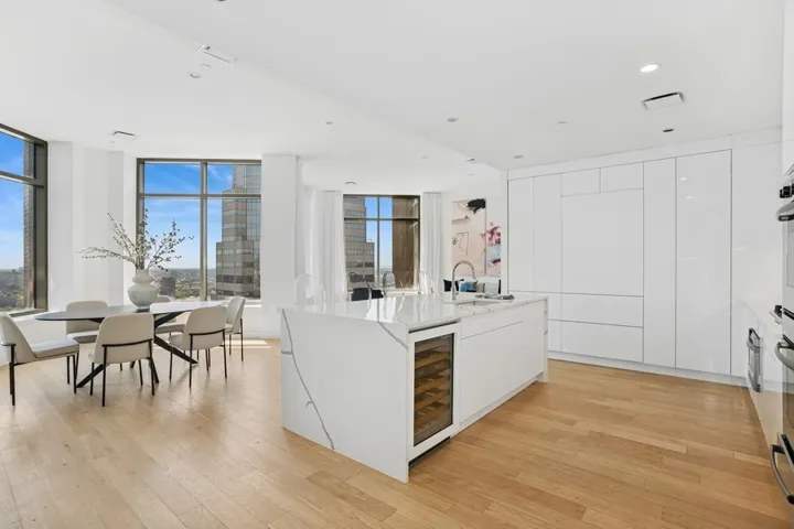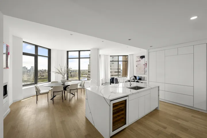 Residents are greeted by a grand, open-plan living room , dining room , and kitchen with a gas-burning fireplace , wide plank cerused oak floors, and a wall of oversized prow windows. The stunning Boffi chef’s kitchen boasts a huge eat-in island, custom lacquer cabinetry, granite countertops, a mosaic tile backsplash, and fully integrated high-end appliances from Miele, Sub-Zero, Liebherr, Bosch, Electrolux, and Sharp .
