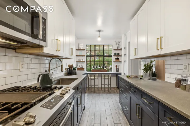 At the heart of any home is the kitchen and this absolutely delivers! Thoughtfully designed to maximize storage and beautifully renovated with shaker-style cabinetry, classic subway tile back splash, stone counters and porcelain tile floors. A desk/workspace has been seamlessly incorporated under the oversized casement windows with additional storage and shelving.