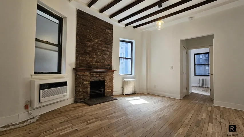 The charming and cozy 1BR 1Bath pre-war Co-op, 11ft high beamed ceilings with a wood burning fireplace exposed brick. There is stainless freezer and gas cooktop with updated kitchen and convenient granite counter. The bedroom accommodates a Queen sized bed, windowed bathroom is stylishly renovated with bright, contemporary with glass shower stall and a hall closet offers plenty of storage.