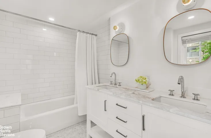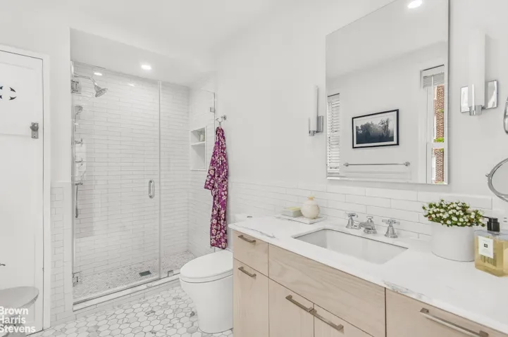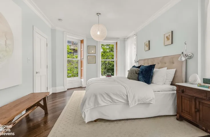 Beyond the kitchen, discover spaces bathed in natural light, thanks to the home’s triple exposures, with an impressive array of 35 windows and a rooftop skylight. Corner rooms with double exposures offer tree-lined street views and an abundance of sunlight, creating warm, inviting environments throughout the day. For the ultimate in cozy ambiance, there is a parlor floor woodburning fireplace, elegantly surrounded by Calacatta Ora marble, perfect for drawing together on crisp New York evenings. On the ground floor there is another large living room/den, in which to play games, exercise, watch movies or just chill.