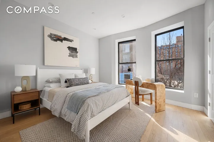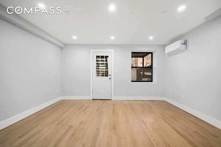 The garden-level unit has a private entrance, an open kitchen/living area, and a spacious bedroom with a full bath. Below, the finished 800-square-foot cellar provides additional living or storage space, with potential for rental income or private owner use. The entire property has been expertly renovated, including new plumbing, a new roof, a modern HVAC system, a new boiler, and white oak flooring throughout, while preserving its historic brickwork, brownstone facade, original cornice, and grand staircase.