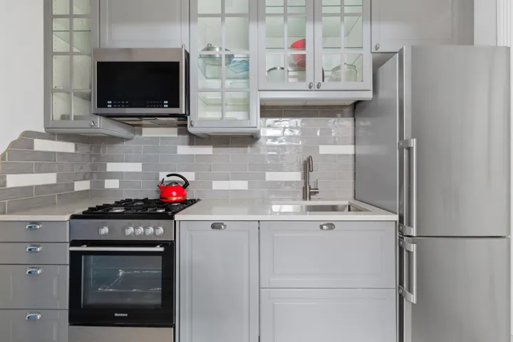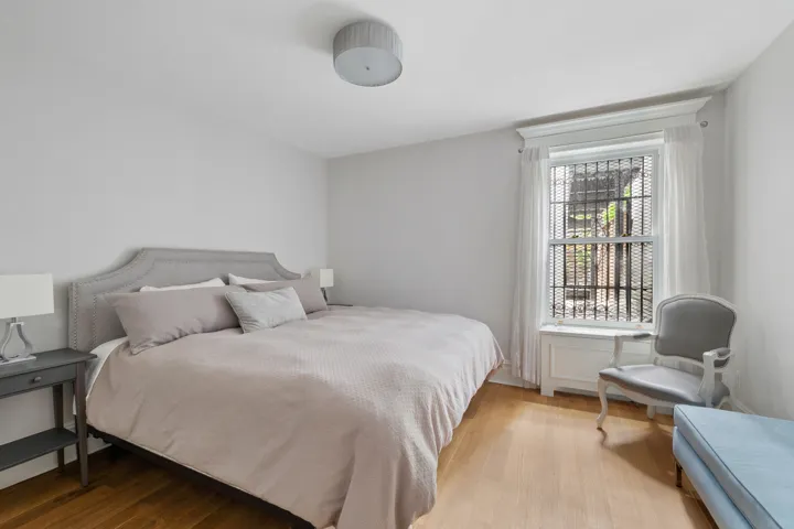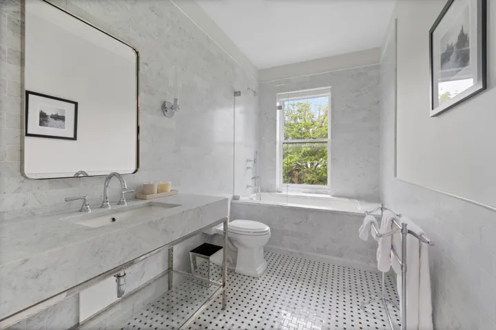 The garden level is equally impressive. A large media room with radiant-heated Moroccan tile and a built-in wet bar opens to the tranquil backyard through floor-to-ceiling accordion-style NanaWall doors. This level also includes a second powder room, additional laundry room, and abundant storage. Below, the finished cellar offers a multiuse rec room with original arched brick columns, generous ceiling height, AV closet, and additional storage. The garden-level one-bedroom apartment-perfect for guests, in-laws, or income-has been renovated to the same exacting standard, with a full kitchen, dishwasher, and in-unit washer/dryer.