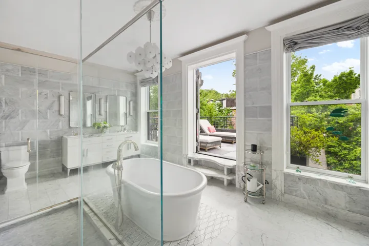 The full-floor primary suite is a true sanctuary, offering a spacious bedroom, a large walk-in closet (plumbed for a future wet bar), and a spa-like bathroom with radiant heated floors, a deep soaking tub, double vanity, and a gas fireplace, all with access to another private terrace and remote-controlled awning-an indulgence rarely seen in townhouse living. Up the restored staircase, past a statement pier mirror and under a dramatic skylight, the top floor offers two large bedrooms (one with en-suite bath), a third flexible bedroom or office, a full hall bath, and a laundry room.