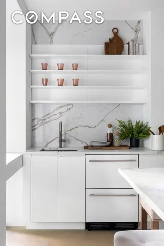 Garden Floor/Under the Stoop: The gourmet kitchen opens to a planted garden with awning and plumbed Weber grill. The kitchen features a waterfall quartzite island, top-of-the-line Wolf and Sub-Zero appliances, two ovens plus a built-in MW, wine fridge, custom white cabinetry, extensive storage and butler’s pantry. Adjacent is a library/media room with pretty bay window, full bathroom and wet bar.