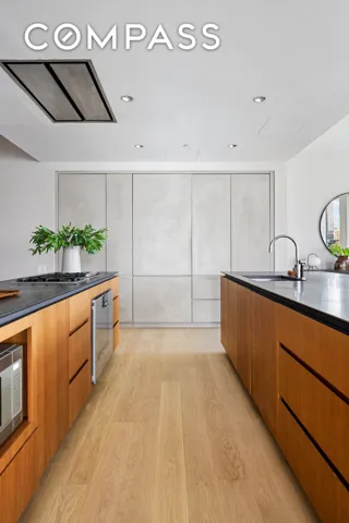 The expansive open-concept living and dining areas make this home the perfect space for entertainment and/or everyday living. The sleek, modern kitchen is equipped with a suite of top of the line appliances including Gaggenau, Sub Zero, and Bosch, as well as two stone counter islands, a vented ceiling hood, wine refrigerator, and beautiful rough-sawn oak Italian cabinetry by RiFRA.