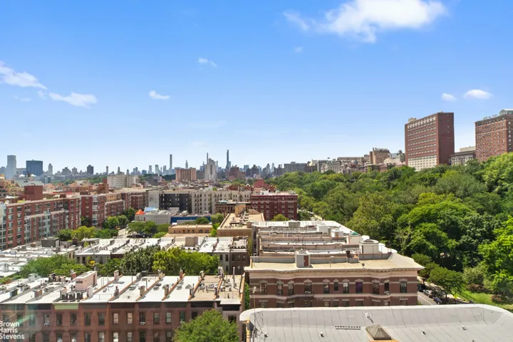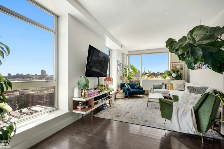 First top floor 1 bed unit available since initial construction, apartment 12D is a Specialty Unit- large, loft style, 1 bedroom gem with sweeping views of Morningside Park and Midtown Manhattan. This apartment is highly versatile, with an open floor plan and square footage to spare. The unit is flanked by eastern and southern exposures, absolutely bathing the apartment in light from sunrise to sunset. The bedroom can easily accommodate a king bed with nightstands at both sides, and boasts its own over-sized view of the expanse of Morningside Park and beyond. The apartment shares only two walls with no one above you, providing a rarely matched sanctuary of peace and privacy in the frenetic heart of Manhattan.88 Morningside is a full service luxury condop at the southwestern edge of Harlem. Adjacent to Morningside Park, it is convenient to the A,B,C,D express trains, the m60, Columbia University, and the stellar dining and nightlife offered on historic Frederick Douglass Boulevard. The doorman/concierge is in place from 7am to 11pm, and the super lives on-site. The building offers a jaw dropping roof deck with built in grill and bar seating – available for private reservations. There’s also a media room/lounge with 67″ television, ping pong, and pool table. The resident gym is open 24/7, and each apartment has its own reserved spot in the bike room, and a deeded storage cage. Perhaps best of all, the tax abatement continues through 2027.