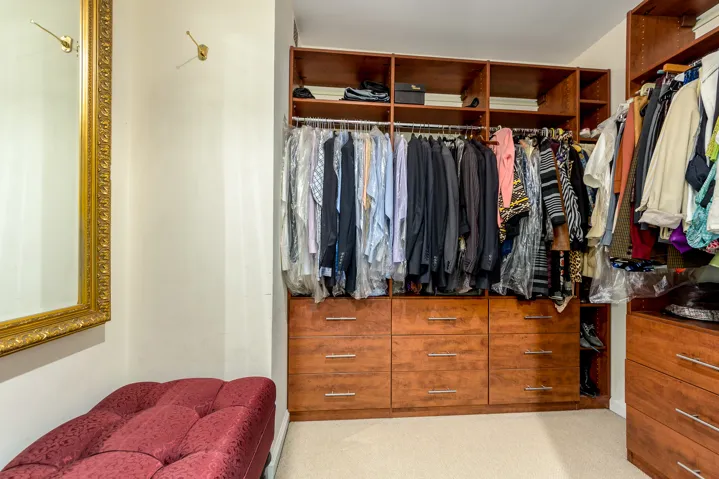 An elegant staircase with custom decorative details leads to the expansive primary suite—a tranquil retreat featuring exceptional proportions, a sumptuous marble bathroom, and an oversized 8′ x 10′ walk-in closet, easily adaptable as a home office or dressing room. Finishing touches such as crown moldings, crystal light fixtures, and refined wall sconces lend timeless sophistication. Central air conditioning on each level ensures year-round comfort, while generous, customized closet space enhances everyday functionality. With dual entrances, the smart layout offers privacy and convenience for both residents and guests.