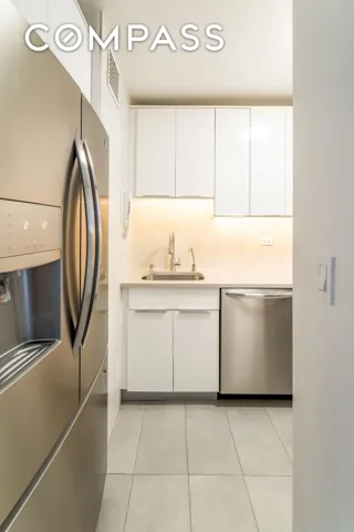 A 30+ foot long living room welcomes you into the unit with abundant space for any living configuration. Soundproof windows span the width of the apartment providing bright, steady light throughout the day and present stunning views of the skyline, East River and the iconic “black and white” landmarked townhouses that look like a postcard of London! The gut-renovated kitchen exemplifies sleek, gorgeous design. Countertops and backsplash blend beautifully with white ceiling-height, soft-close custom cabinetry and a suite of new appliances with refrigerator, gas oven and stove, microwave and dishwasher. The primary bedroom suite accommodates a king bed plus furniture, and offers three large closets including a walk-in! Like the living space, the bedroom offers immersive river views and amazing light. The renovated en-suite bathroom offers a step-in tub / shower and modern vanity with vessel sink. The powder room is also renovated and conveniently accessible to guests from the living room. The original dining alcove has already been converted for use as a second bedroom, also boasting river views. New flooring and city quiet windows have been installed throughout. The apartment also comes with its own private storage locker at no additional charge.