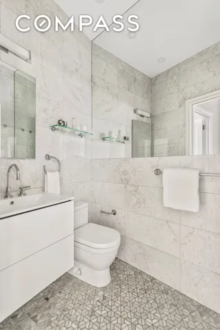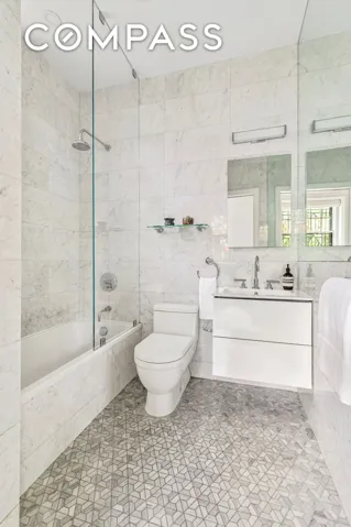 The corner primary bedroom is a bright and tranquil retreat, offering generous closet space, three large windows, and a spa-like ensuite bath finished in floor-to-ceiling Carrara marble and outfitted with elegant Duravit fixtures. The second bedroom is also generously proportioned with ample closet space and two windows. A second full bathroom, equally refined with modern fixtures, a spacious stall shower, and floor-to-ceiling marble, also serves as a convenient powder room.