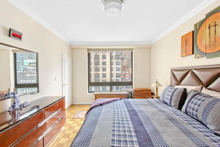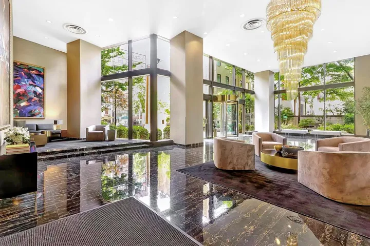 This sun-flooded 1-bedroom, 1.5-bathroom home features expansive floor-to-ceiling windows with both southern and western exposures, filling the space with brilliant natural light by day and glittering city views by night. The flexible layout offers generously proportioned living and dining areas, allowing for seamless entertaining or the potential to convert into a two-bedroom residence. The king-size bedroom enjoys tranquil views overlooking a private, tree-lined garden and is bathed in sunlight throughout the day.