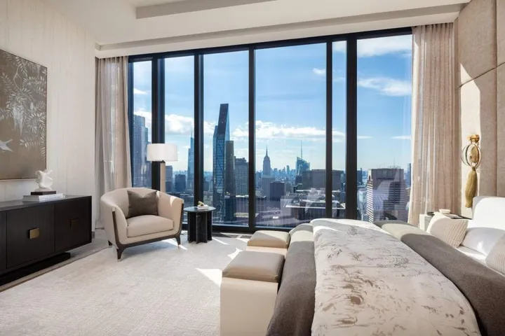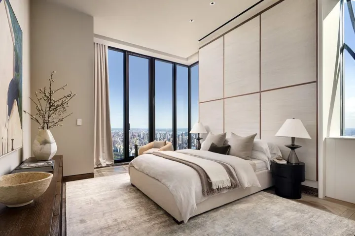 The Secondary Bedrooms, each with striking views, one facing north over Central Park and the other facing south with breathtaking city skyline views. Both are generously proportioned with en-suite bathrooms finished in a distinctive crystallo gold quartzite and custom Studio Sofield designed fixtures.