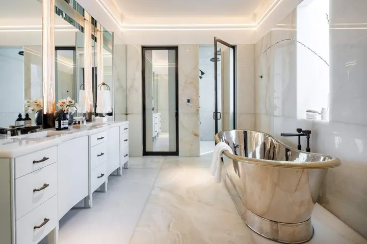 The luxuriously appointed Primary Bedroom Suite features southern skyline city views, two walk-in closets and a windowed Bathroom clad in hand selected veined white onyx. The custom freestanding polished nickel bathtub is by William Holland and beautiful, custom-designed fixtures are hand-cast by P.E. Guerin, the only foundry still operating in New York City.