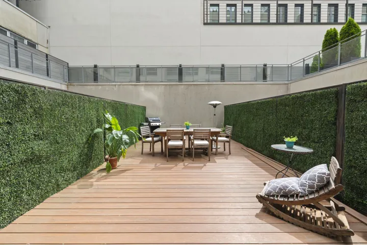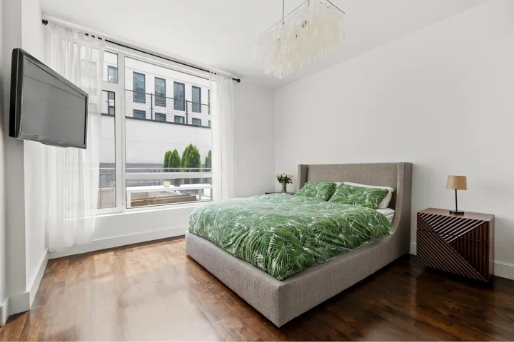 Rarely offered Garden Duplex convertible to 3 bedrooms. Set in a contemporary condominium one block from McCarren Park, this impeccably designed duplex apartment spans 1,285 interior square feet and 684 exterior sf on two large outdoor spaces. The apartment also features oversized windows, high ceilings throughout, and a very flexible layout. The entry level features a large open space with ample room for living and dining areas, served by an immaculate modern open kitchen. Here, you’ll find gleaming white lacquer and glass cabinets, dark wenge millwork, Jenn-Air stainless steel appliances, Caesarstone counters, and upgraded pendant lighting above convenient breakfast bar seating. Off the great room you will find a generous terrace extending the full width of the apartment, perfect for barbecues and outdoor dining. This level also includes a large primary sutie with ample closet space. Additionally, there is a full-sized bathroom on this level that includes plenty of storage and an extra deep soaking tub.
