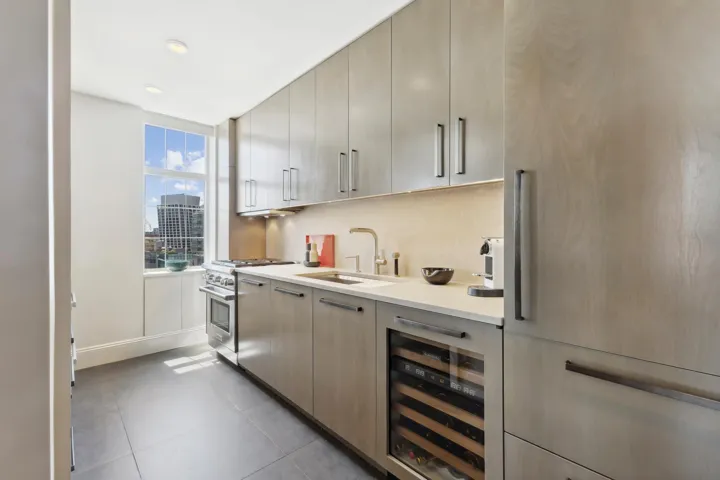 The expansive, 36-foot-wide living and dining area is ideal for both intimate evenings and grand entertaining. Anchored by a marble-clad, wood-burning fireplace, the great room features four oversized windows that frame breathtaking views of the Chelsea Historic District and the city skyline beyond. Adjacent, a separate dining area (easily converts to a third bedroom) comfortably seats 8-12 guests beneath recessed lighting, offering the perfect ambiance for curated gatherings.