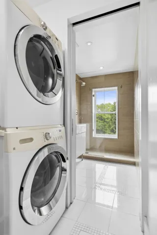 On the second level of the triplex, the eastern-facing primary bedroom suite features a windowed bathroom equipped with both a separate shower and soaking tub. The adjoining second bedroom, currently used as a den, is flanked by double-sided, floor-to-ceiling custom closets and two sets of tall pocket doors, offering a versatile and beautifully designed space.