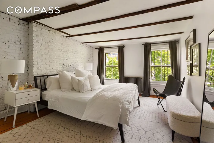 Downstairs, the south-facing guest bedroom features exposed brick, ample closet space, a decorative fireplace and adjacent full bathroom in the hall. North through charming arched thresholds, you enter the primary suite replete with a small alcove office, wood-burning stove, a tin ceiling, an en-suite windowed bath and unbridled access to the 48-foot garden festooned with a mix of mature evergreens and flowering shrubs. Waking up never looked so pretty! From this level you can access Pacific Street through the garden level entry and also the cellar, which is the full footprint of the house bearing endless storage. The cellar is also equipped with a washer/dryer.