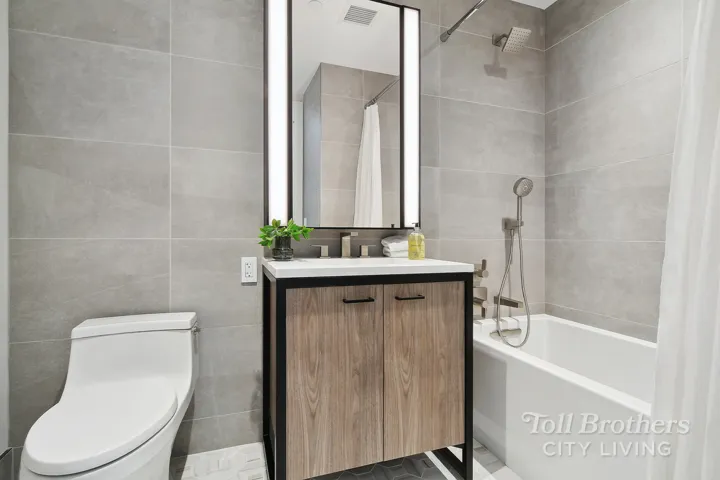 Residence 6H is a 1132 SF 2-bedroom/2-bath home with 9’ ceilings, oversized windows and 5″ white oak floors. A gracious layout offers a complete separation of shared and private space. The living room overlooks quiet 103rd Street, while the bedrooms are south-facing over tranquil tree-filled back yards. The luxurious en-suite primary bathroom is clad in polished Bianco Estremoz marble and features Calacatta Delicato marble countertops and a custom Poliform vanity with ample storage. The second bathroom features a custom Poliform vanity topped with quartz, full-height Porcelanosa tiled walls, and a porcelain mosaic tile floor. The island kitchen features custom Poliform cabinetry with abundant storage, integrated Thermador appliances, and striking Brazilian quartzite countertops and backsplashes. Each home is equipped with a full size Whirlpool washer and dryer.