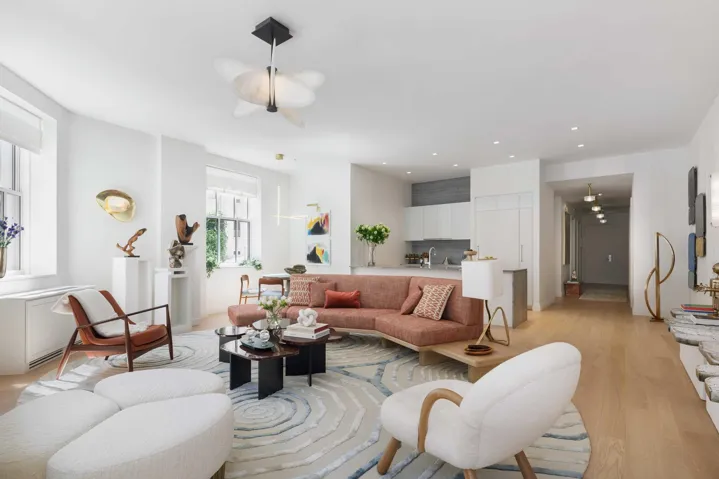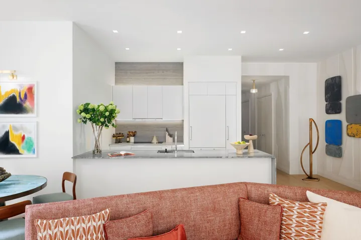 Warm stone primary bathrooms feature large walk-in showers with thermostatic controls. Mirrored medicine cabinets are integrated with LED lighting with Silver Romano Travertine honed floors. The building’s one-of-a-kind residences maintain the integrity and character of the 1930s scale, a modern take to art deco detailing, and boast ceiling heights over ten feet throughout with wide-plank French Oak hardwood floors underfoot.