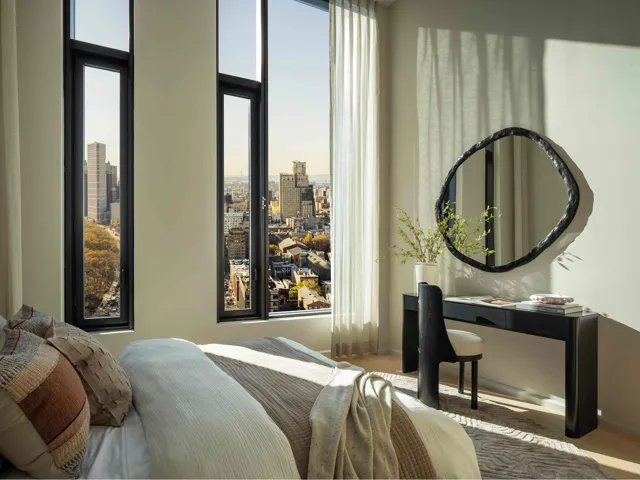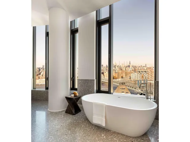 The Manhattan Bridge-facing primary suite features double walk-in closets, a linen closet, and an exceptional en-suite bathroom. With Agglo Ceppo honed stone walls, flooring and countertops, a custom double vanity with satin nickel pulls, deck-mounted faucets and controls, dual water closets, dual showers, and a freestanding soaking tub.