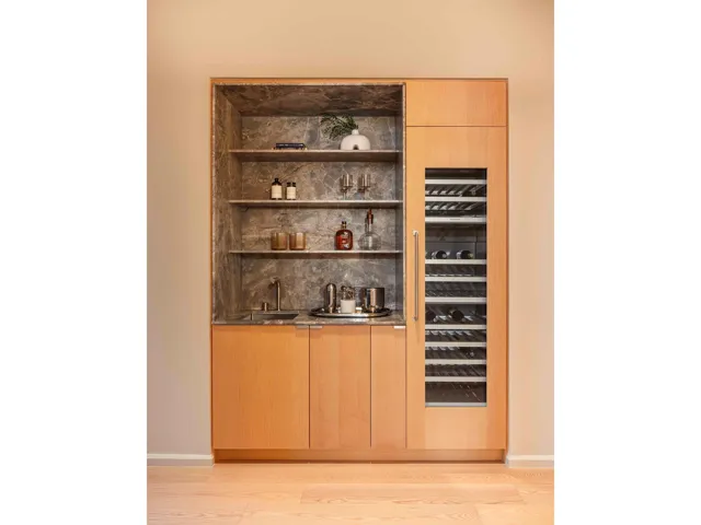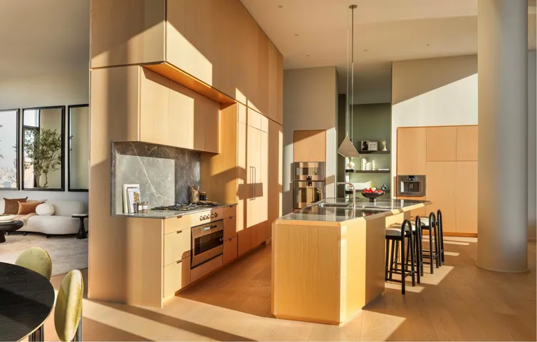 Arriving home via elevator to a private landing, the formal foyer and gallery lead to the sun-filled living and dining areas, highlighting remarkable views of the Brooklyn Bridge, Manhattan and New York Harbor. The living area is finished with a wet bar featuring white maple cabinetry, Calacatta Vagli Oro marble backsplash, stainless sink and a Thermador wine cooler.