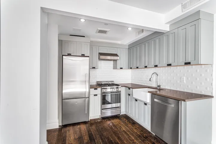 Unit 1B is a recently renovated apartment with high ceilings, beautiful dark hardwood floors, and oversized double-pane windows providing lots of natural light that minimizes outside noise! The main living area is roomy enough for a separation of space. You can easily fit a queen bedroom set and still have room for a small sofa and TV.