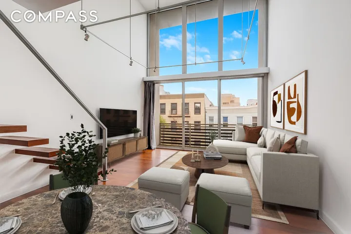 This sun-drenched 2-bedroom, 1-bath duplex impresses with 17-foot double-height ceilings and a dramatic floor-to-ceiling glass wall that floods the home with natural light. The open-concept living and dining area flows seamlessly to a private balcony, perfect for morning coffee or evening relaxation with neighborhood views.