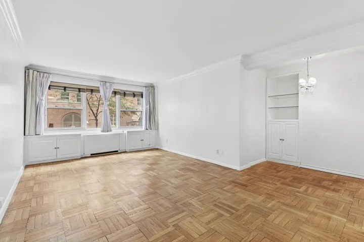 Beautifully appointed and spacious, this delightful studio residence features three street-facing windows that flood the space with natural light. The thoughtfully designed interior includes classic crown moldings, a cozy sleeping alcove, wood kitchen cabinetry, and a bright, white-tiled bathroom. Ample storage is provided by a double sliding mirrored closet and custom built-in shelving.